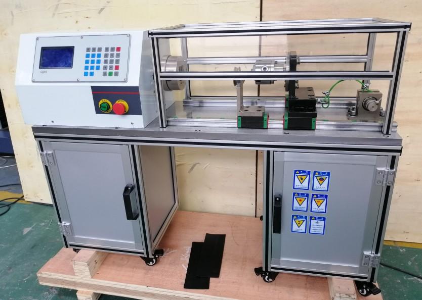 該機型采用高性能交流電機作為動力輸出,配以高精度減速電機,從而使動力能平穩輸出。電機的驅動采用高可靠、高穩定變頻器,提高機器運行的平順性,降低功耗。一側夾頭固定在電機輸出軸,另一側夾頭固定在可移動軸承座。移動座采用直線軸承,摩擦阻力小,保證了軸向移動的平直度。軸向拉緊力采用砝碼施加,通過10:1的L型杠桿,將作用力施加在線材上。