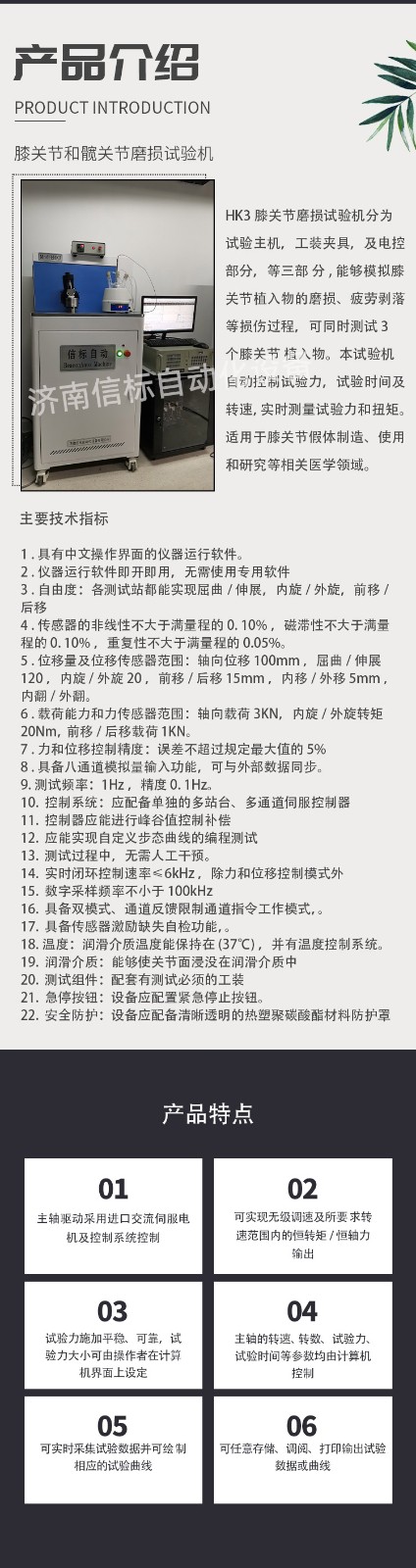 濟南信標自動化設備有限公司主要生產:動靜態萬能疲勞試驗機,接骨板彎曲試驗機,縫合線拉伸疲勞試驗機,髖膝關節磨損試驗機,電子萬能試驗機、液壓萬能試驗機、巖石三軸、四軸,電液拉力試驗機,材料試驗機,高低溫蠕變,高低頻疲勞,拉伸、扭轉、杯突等二十多個系列兩千多個的品種。