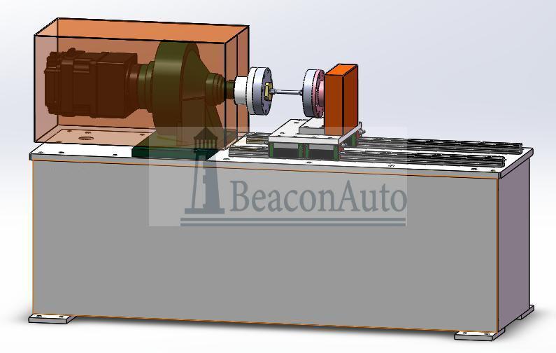 人工假體抗扭矩試驗(yàn)機(jī)主機(jī)采,用臥式結(jié)構(gòu),右端為加載端,通過伺服電機(jī)和減速系統(tǒng)輸出扭矩,左端為移動端;能根據(jù)試樣的要求調(diào)節(jié)空間。扭矩傳感器安裝在調(diào)節(jié)空間支座之上。移動端是通過直線導(dǎo)軌傳動,保證施加扭矩的時由于間隙導(dǎo)致角度不準(zhǔn)確。